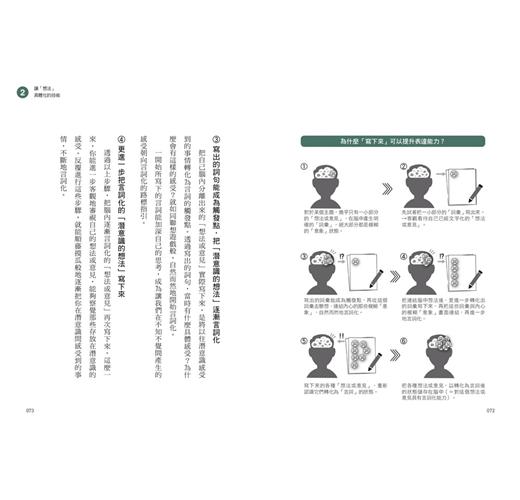 當漸漸習慣本書使用的言詞化表達練習,把腦海中模糊的意象不斷地轉變為明確的文字,這麼一來,增加平時腦中的「明確言詞」、提高腦中「文字顯現的解析度」,就能在緊要關頭信手拈來所需的語彙。