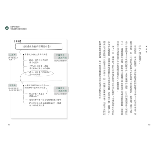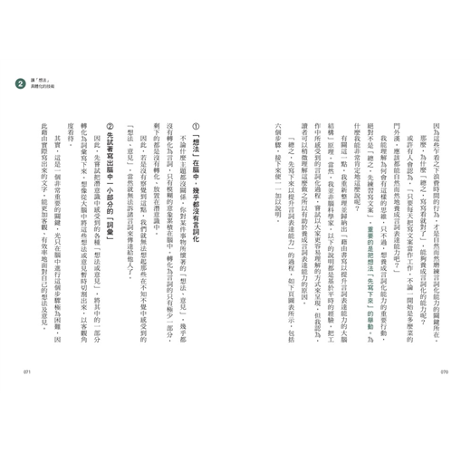 第二章,則要介紹「如何才能把想法轉化為言詞」,以及「為什麼要用A4紙」,更加具體地解說練習的結構。