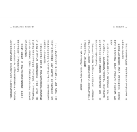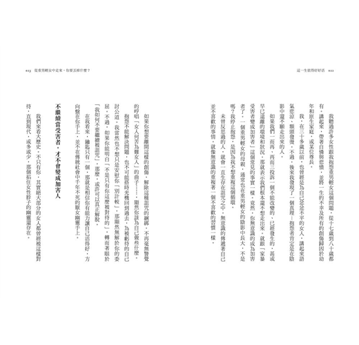 這本書是她為女性而寫。寫身為一個女人的「不遺憾主義」之種種,分享在這個轉變迅速的時代,身為一個女性「到底該怎麼活」,以及在她有限的視野中所得知能夠活得好的有趣原則。