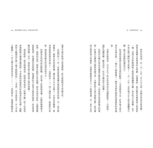 我們來看大歷史。不只有你,其實絕大部分的女人都曾經被這樣對待,直到現代,或多或少,那個掐住女性脖子的幽靈還存在。相信你知道,在一九一八年二月六日之前,英國女性沒有投票權,即使是劍橋大學畢業的女學霸,在選舉時,地位跟男性精神病人和罪犯一樣,差別只在於精神病人和罪犯被褫奪公權,而女性天生無權。在千年來以農立國的東方更慘了,一九一八年,有些地方女人甚至還纏著小腳,最不肯放開的還是自己。
