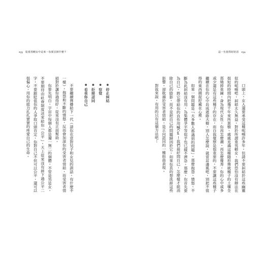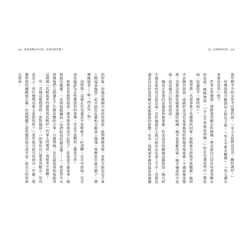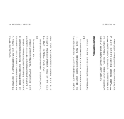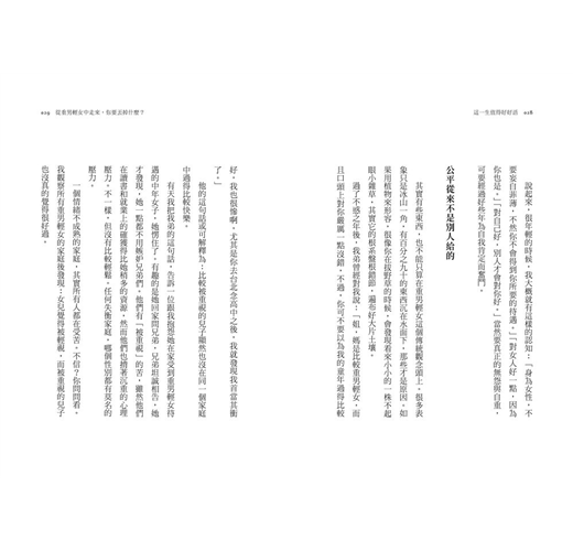 我是姐姐,我有兩個弟弟。照理說來我是「珍稀少數」吧?但我當然被媽媽告誡過各種話語。不管我如何想要用好表現來討好母親,我聽到的大概都是什麼「豬不肥肥到狗」、「考第一名不要得意,女人不要太驕傲」、「女人讀太多書沒有用」……。一直到現在,我還常聽到比我年輕不少的女性不自覺的說:「女人太能幹沒有用,剛好就好。」你應該很少聽到有人對兒子說:「男人不要太驕傲」、「男人讀太多書沒有用」吧?