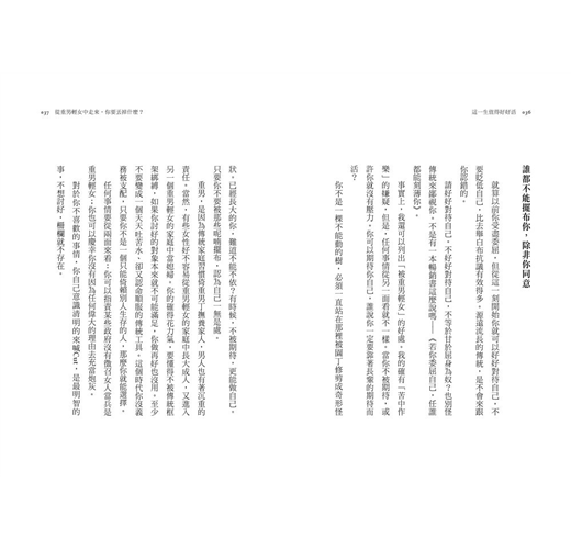 你不是一棵不能動的樹,必須一直站在那裡被園丁修剪成奇形怪狀。已經長大的你,難道不能不依?有時候,不被期待,更能做自己。只要你不要被那些呢喃擺布,認為自己一無是處。重男,是因為傳統家庭習慣倚重男丁撫養家人,男人也有著沉重的責任。當然,有些女性好不容易從重男輕女的家庭中長大成人,又進入另一個重男輕女的家庭中當媳婦。你的確得花力氣,要懂得不被傳統框架綁縛,如果你討好的對象本來就不可能滿足,你做再好也沒用。至少不要變成一個天天吐苦水、卻又認命順服的傳統工具。這個時代你沒義務被支配,只要你不是一個只能倚賴別人生存的人,那麼你就能選擇。任何事情要從兩面來看:你可以指責某些政府沒有徵召女人當兵是重男輕女;你也可以慶幸你沒有因為任何偉大的理由去充當炮灰。