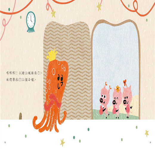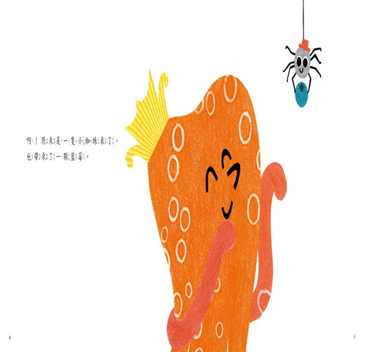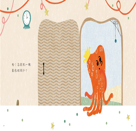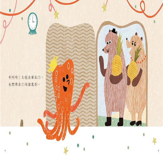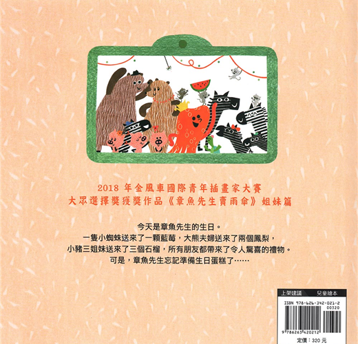 今天是章魚先生的生日。一隻小蜘珠送來了一顆藍莓,大熊夫婦送來了兩個鳳梨,小豬三姐妹送來了三個石榴,所有朋友都帶來了令人驚喜的禮物。