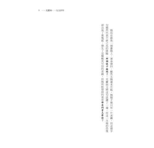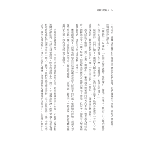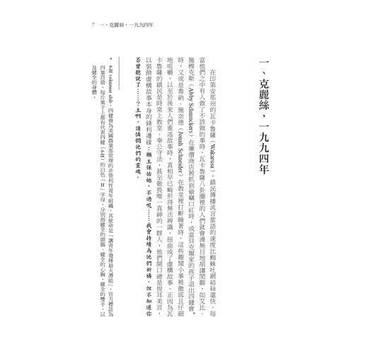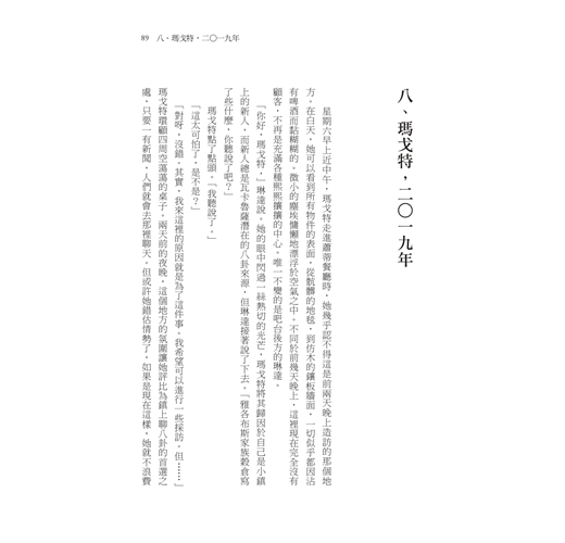 終於,她聽見後方有些動靜,接著有個男人在走道上探出頭來。「喔!」他一邊說,一邊拿起胸前長鏈上的一副掛脖眼鏡,將眼鏡放於鼻梁上,瞇著眼,快步地走了過去。「剛才真是抱歉。我太專心看新聞了,你知道的,發生這種事太可怕,對吧?」瑪戈特還沒來得及回應之前,他就猛然地回頭,好像現在才看見她第一眼一樣。「我很少在此看見陌生面孔。」