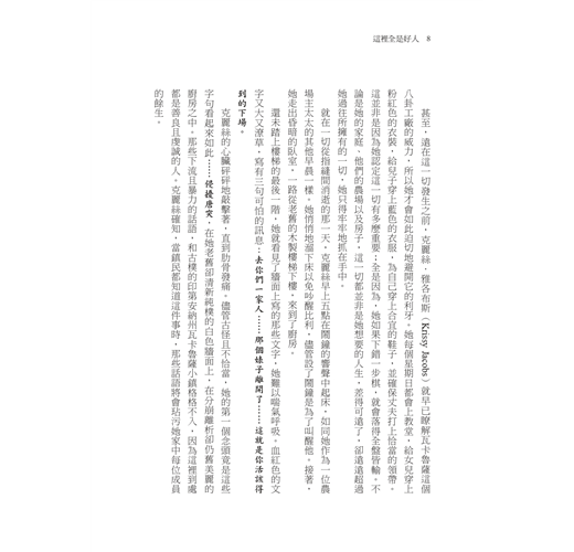 甚至,遠在這一切發生之前,克麗絲.雅各布斯(克麗絲.雅各布斯)就早已瞭解瓦卡魯薩這個八卦工廠的威力,所以她才會如此迫切地避開它的利牙。她每個星期日都會上教堂,給女兒穿上粉紅色的衣裝,給兒子穿上藍色的衣服,為自己會穿上合宜的鞋子,並確保丈夫打上恰當的領帶。這並非是因為她認定這一切有多麼重要;全是因為,她如果下錯一步棋,就會落得全盤皆輸。不論是她的家庭、他們的農場以及房子,這一切都並非是她想要的人生,差得可遠了,卻遠遠超過她過往所擁有的一切,她只得牢牢地抓在手中。