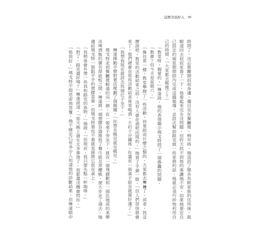 瑪戈特才正要拒絕,但路克早已將她那些手提袋一把抱在懷裡了。他不過才五十歲,記憶就開始衰退,但他看起來一如既往地堅強。當他轉過身時,她偷偷掃視一眼這個小房子,她覺得反胃不安。自從他的妻子蕾貝卡去年死於乳癌以來,這是她第一次進來屋裡。她為了自己沒有早一點來訪而感到內疚。客廳地板上四散的報紙高高堆成了斜塔,茶几上堆滿了骯髒的盤子及玻璃杯,即使她站在前門的位置,她也能看到嵌入式書櫃及老舊電視上蒙上了一層厚重的灰塵。右側的廚房就更加糟糕了。水槽及周圍的流理臺上堆滿了一疊又一疊搖搖欲墜的盤子,杯子上疊放著湯碗,上頭沾有早已成了硬塊的食物殘渣。最令人感到不安的,是座機電話旁邊擺滿了成堆的藥瓶。那裡肯定有十幾個藥瓶,有些是空瓶,有些倒落於桌面上。其中一個大藥瓶裡裝滿了各式各樣的藥物,有混放在一起的白色圓形藥丸及其他淡綠色長型藥丸。瑪戈特並不清楚,這些其中有多少是因為病情診斷的結果,而哪些又是因為他成了鰥夫後才服用。