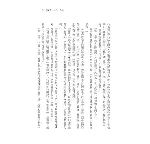 以兩份單純的處方藥而言,瑪戈特等這個男人等太久了,當他回來時,他看起來既慌張又焦慮,拿釘書機將她的白色小藥袋釘好時,他心煩意亂地皺著眉頭。然後,當她正要離開時,一個剛進門的女人從她身邊走過,手機緊貼在耳朵上。那個女人全神貫注地對話,似乎完全沒看見瑪戈特。但正當大門在她身後關上之前,瑪戈特聽到那女人說:「我知道,我早就跟你說了,雅各布斯夫婦是無辜的。」
