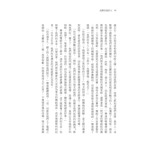 她收緊了笑容,但只有些微的緊繃。從她決定搬回去的那一刻起,她就知道會發生這種事。一談及路克和蕾貝卡時人們不確定的表情,但談及她父母時就會出現奉承討好的表情。在他們一家搬離之前,她的父母一向是瓦卡魯薩的完美居民,會搬去辛辛那提,表面上是為了她父親令人興奮的新工作,但實際上是為了讓他進勒戒中心,勒戒治療不僅不管用,反而讓他變得比過往更岔恨且刻薄。