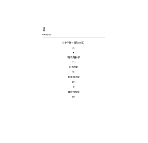 全書包含四個章節,探討了人與自然關係,其衝突與解方;從根源追溯科學與法律既交織又歧異的關係;最後,以繩索解讀人類文明,人的歷史就是不斷的連結與解索。