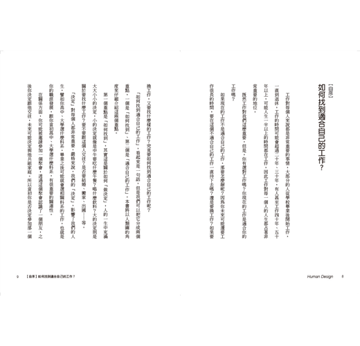 「如何找到適合自己的工作」,看起來是一句話,但是我們可以把它分成兩個重點,一個是「如何找到」、第二個是「適合自己的工作」。本書將以人類圖的角度來仔細介紹這兩個重點。