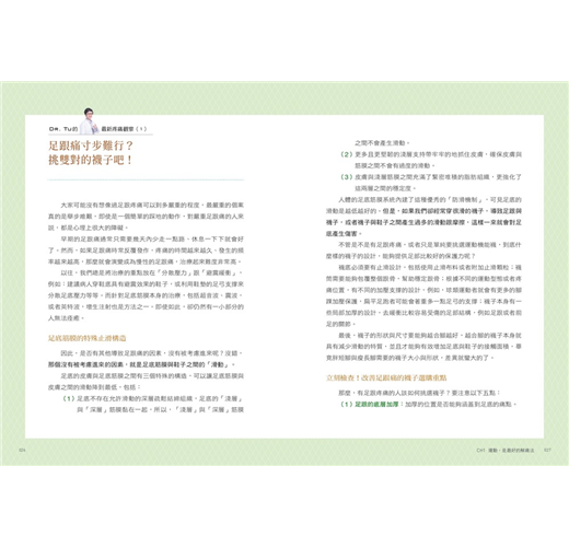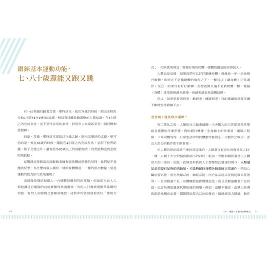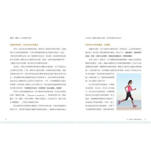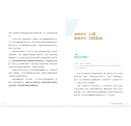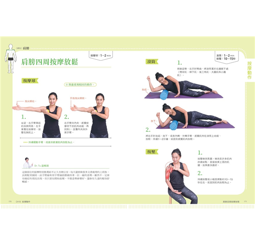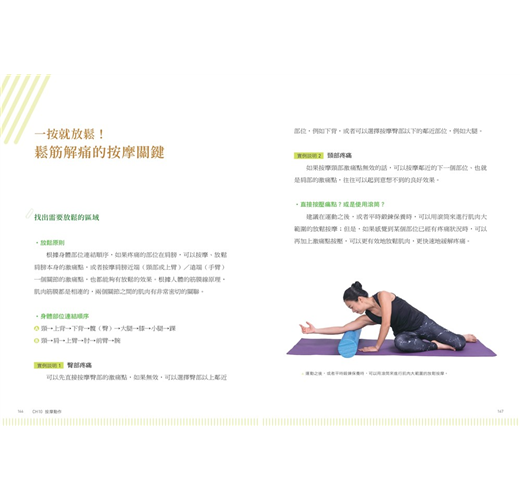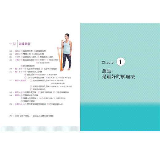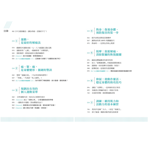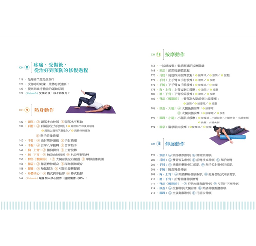 全書以「健康運動、預防傷害、放鬆解痛」為三大主題,設計了「暖身、(減速)訓練、(筋膜線激痛點)按摩、(收縮-放鬆[PNF])伸展」四種類型、共92個動作,從頸部開始,沿著全身8個主要關節,活化並訓練全身的肌群,讓肌肉收縮力成為關節的保護力,全方位強化並修復身體的運動功能。