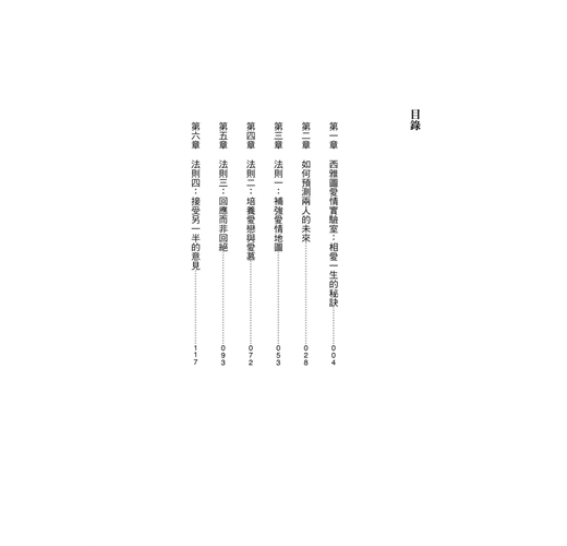 書中各章並附上相關評量,提供讀者檢視自己對另一半的熟悉度、正面觀感、感情帳戶餘額,認識衝突的根源,並找出兩人共同生活的意義。