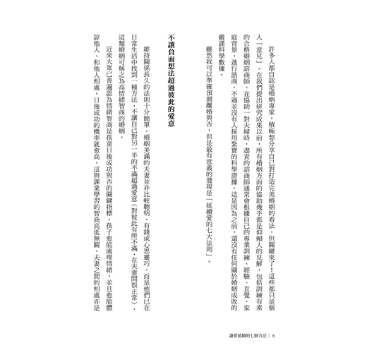作者綜合研究對象的婚姻危機整理出六大特徵,其中最有創意又貼近生活的就是四騎士(批評、輕蔑、辯解及停止溝通)。夫妻經常不自覺地邀請這些騎士進駐婚姻關係中,再加上其他五個危機特徵,婚姻也就岌岌可危了。好在高曼知道如何對症下藥,研發出七個法則,在每章中詳細說明,教導運用,以引導夫妻朝向和諧長久之美好關係。其中愛情地圖的概念就是要打破「結婚是愛情的墳墓」之迷思。