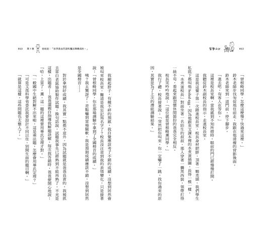 我縮起脖子,有種不祥的預感。我自覺應該考了不錯的成績,沒想到居然會被叫來校長室,難道是我忘記寫名字了?校長沒注意到我的表情變化,只是接著說:「曾根崎同學,你在那場測驗中拿到了全國榜首的成績。」