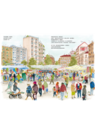 藝術家在書中藉由細膩的手繪插畫,將讀者一秒帶到義大利的廣場上,繽紛的用色使人心情愉悅,彷彿真的走在歐洲街頭,在各個攤位間流連忘返,一邊在紙上逛個過癮,一邊探索新的靈感。