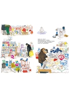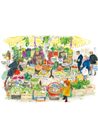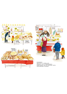 《市場裡的一天》的故事從祖孫倆的購物之旅開始,她們穿梭在販賣各式生活雜貨、新鮮食品的攤位間,沿途看見服飾、碗盤、蔬菜、海鮮、麵包⋯⋯各種琳瑯滿目的商品。每一頁都充滿了豐富的細節,透露出濃厚的生活氣息,讓人忍不住想要一探究竟。
