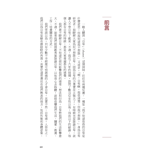 「自卑是令人積弱不振的深刻情緒,讓我們擔心自己不夠好。我們可能對自己的一切感到自卑――舉凡身材、口音、財力、皺紋、體重、疾病、每日開銷等等。本書邀請大家檢視自己內心掙扎的自卑,學習如何變成最真實、最好的自我。本書以獨到的學術研究為基礎,充滿激勵人心的故事,是少數有潛力逆轉人生的佳作。」──《生氣的藝術》作者海瑞亞・勒納博士