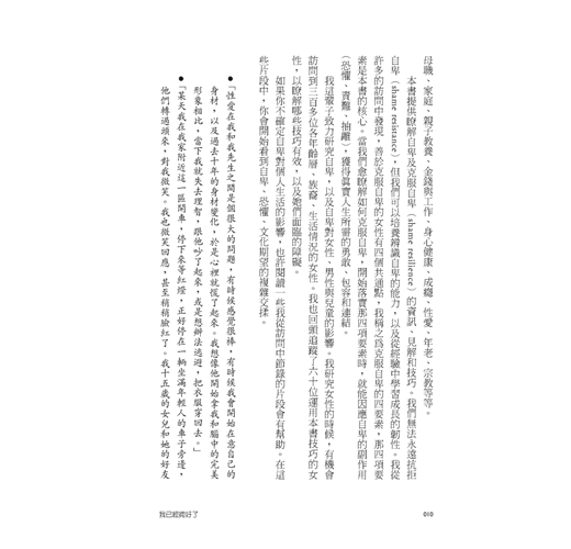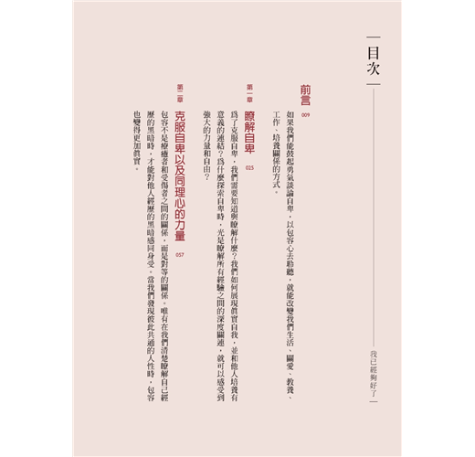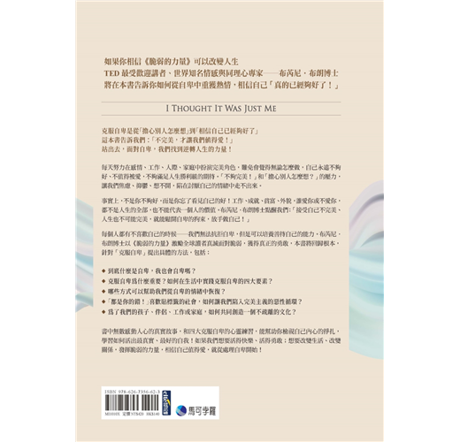 事實上,不是你不夠好,而是你忘了看見自己的好!工作、成就、貧富、外貌,誰愛你或不愛你,都不是人生的全部,也不能代表一個人的價值。布芮尼.布朗博士點醒我們:「接受自己不完美、人生也不可能完美,就能鬆開自卑的拘束,放手做自己!」
