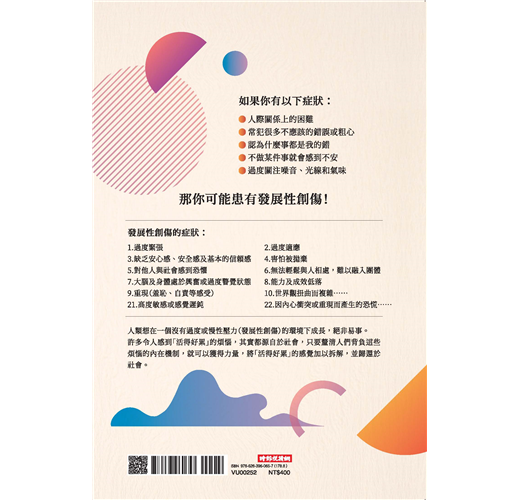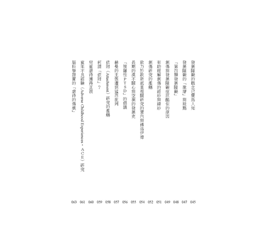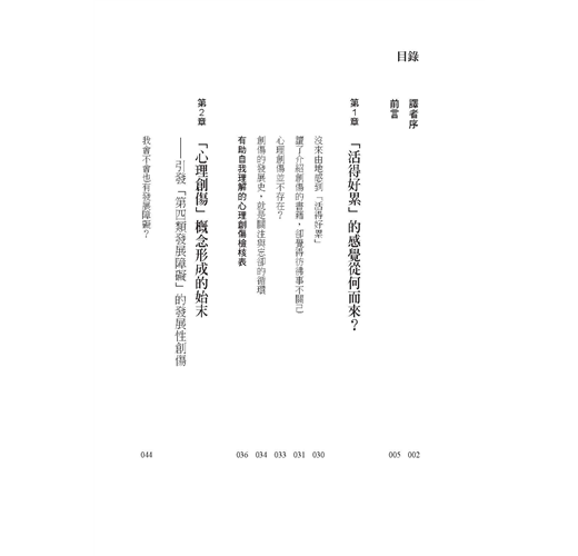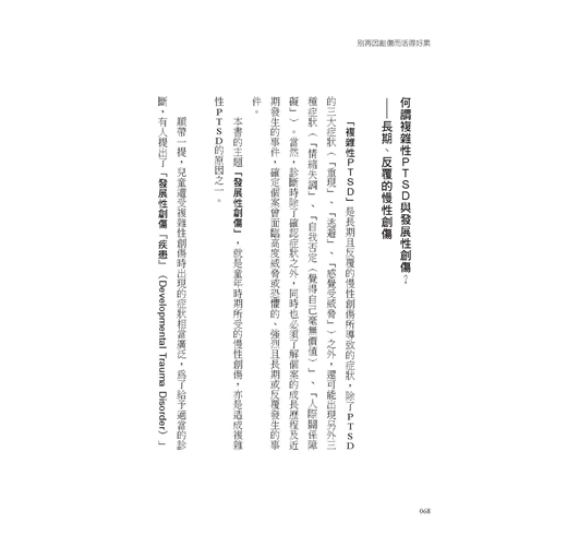本書以「調整環境」→「復原身體(自律神經等)」→「重建自我」→「處理記憶與經驗」→「恢復與他人(社會)的連結」等方法,來幫助你修復創傷。