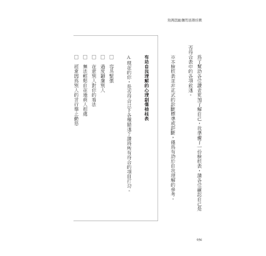 日常性創傷所帶來的「活得好累」的感受,也是不容小覷的問題。創傷可以被歸類為壓力症候群,而不是罕見的特殊症狀。每個人在一生中都會遇到壓力,而這些壓力長期累積,便可能失去平衡。」――摘自本書結論