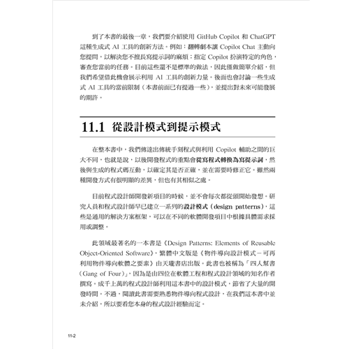 在以往傳統的程式設計課程中,學生往往需要將精力灌注在語法的細節上,然而在 AI 時代,程式語法已經有 GitHub Copilot 這位大神在身邊,完全不用你操心,你該學的是如何用自然語言,寫出有意義且 AI 工具能正確理解的提示詞,讓它為你寫出符合預期的程式碼。如果你真的很不會寫提示詞,Copilot 除了能夠反向幫助程式產生提示詞,甚至還可以利用提示模式(prompt patterns)翻轉問答對象,讓 Copilot 主動提問以達成你的目標。