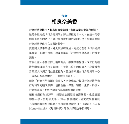 作者相良奈美香是行為經濟學博士,也是在美國執業的商業顧問,協助企業利用行為經濟學解決問題、引介人才。她深知這門學問在商業領域能創造的利益,也是個人提高職場價值的必備素養。可惜的是,一般大眾很難輕鬆學會,因此用心寫下了這本行為經濟學入門書。