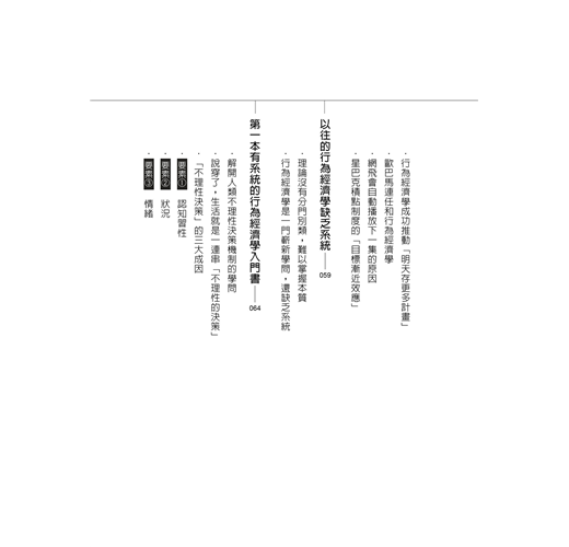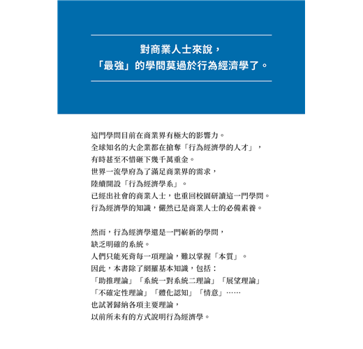 全書融合重要研究與商業案例,將各個理論區分為「認知習性」「狀況」「情緒」,幫助讀者深度理解,掌握本質,將行為經濟學內化為商業素養。