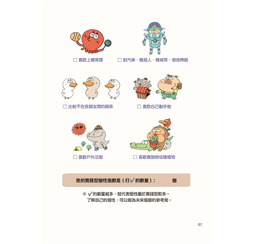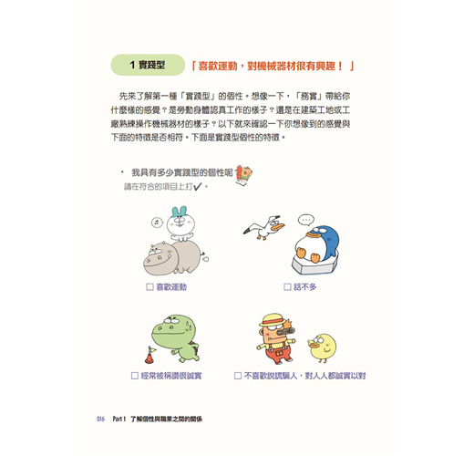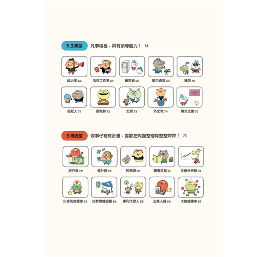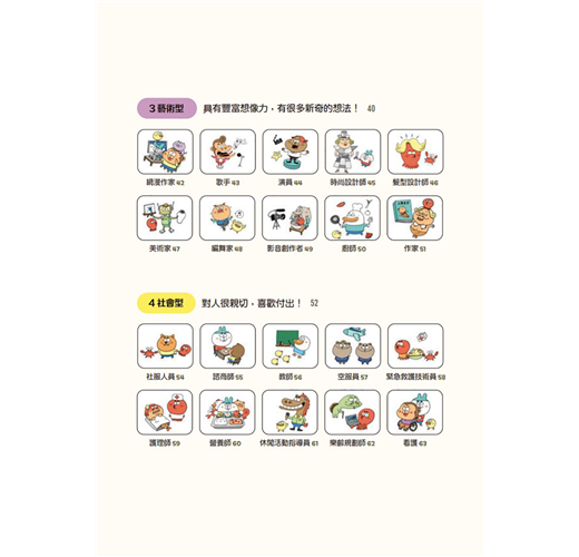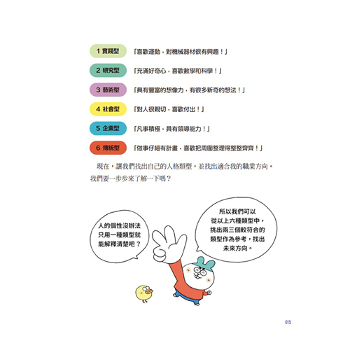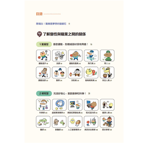 以權威心理學家約翰‧霍蘭德博士(John Lewis Holland)提出的6種性格類型為核心,分為實踐型、研究型、藝術型、社會型、企業型、傳統型,並舉出每種性格類型的10個代表性職業進行介紹。孩子透過性格測驗,將了解自己屬於哪種類型,相關的職業是什麼,以及具體工作內容。