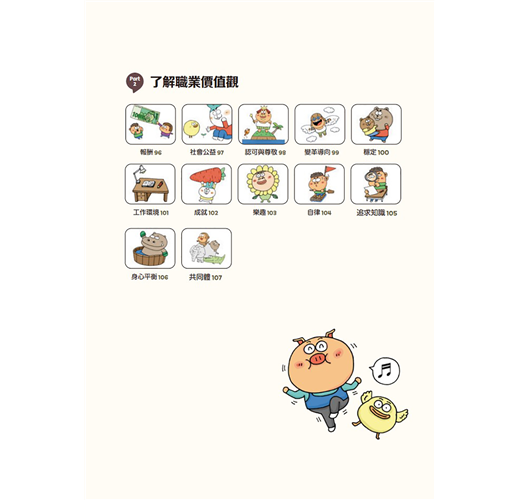 「職業」是指我們的生活方向,只是幫助我們實現夢想的橋梁。作者提出,要擁有適合自己的夢想,建立一個關於職業和生活觀的個人價值觀至關重要。第二、三部分將引導孩子了解「職業價值觀」和「生活價值觀」。