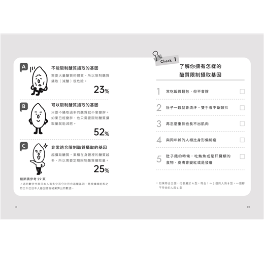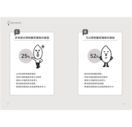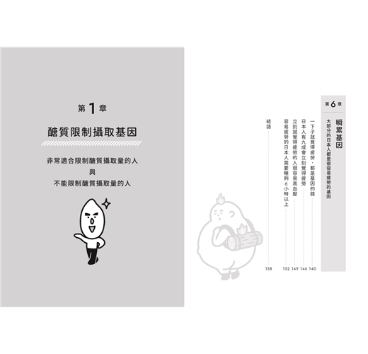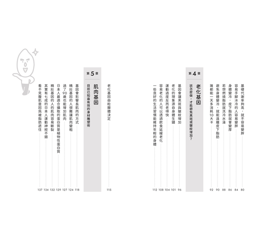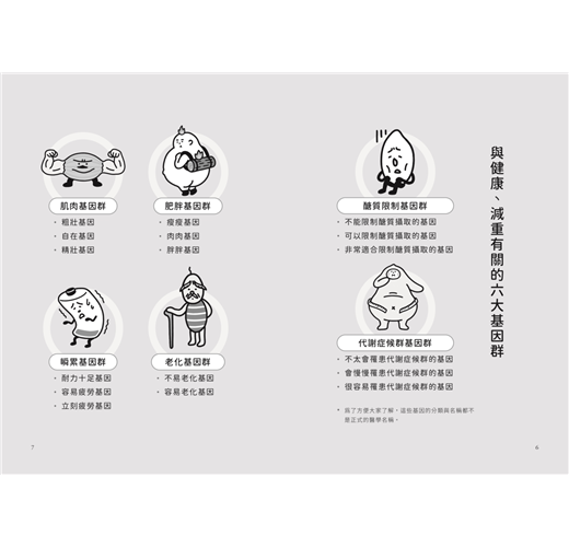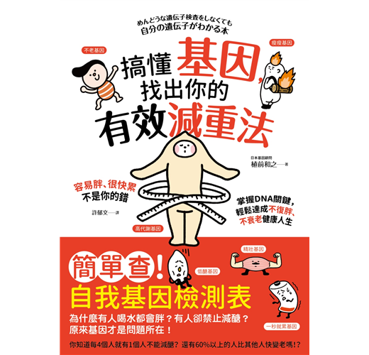 醣質限制基因、代謝症候群基因、肥胖基因、肌肉基因、老化基因和瞬累基因……六大健康基因,了解自己的基因類型,就可以找到適合自己的飲食、運動和保養健康方法。