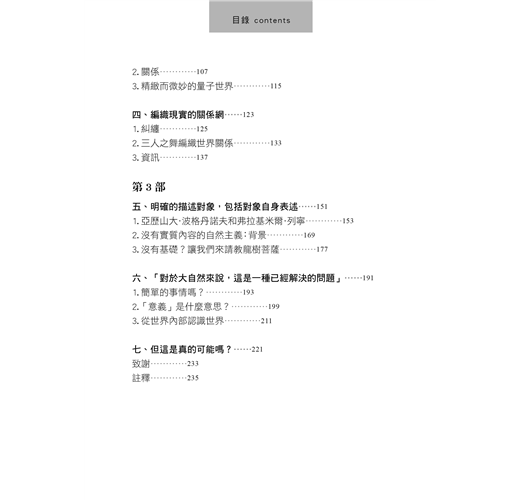 雖然量子理論對世人來說,往往顯得無比神秘又難解,但作者在書中指出,只要把這個世界視為「基本上是由『關係』所組成,而非由『物質』所組成的」,那就可以解開量子理論令人不安的矛盾了。