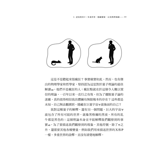 作者以流暢的散文,在書中呈現了量子物理世界裡使人驚異的概念,包含遠端物體神秘地彼此連結、幽靈般的機率波、同時活著又死了的貓咪等。