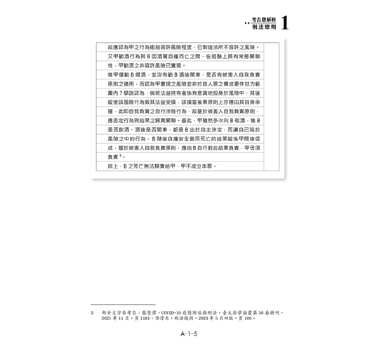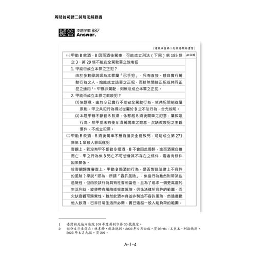 本次改版幅度不小,包含:①調整多處擬答用字;②增刪許多考題、Point和延伸專題;③於書前頁增加2023年12月刑法第185條之3之修法說明;④重要學說更新至2023年12月。有鑒於2023年司律二試刑法考題多在測驗基本觀念,因此這版刪除過難的部分,盡量維持中間的難度。再者,解題書後面有附上一些模板,試著讓讀者在看完整本書後,遇到特定爭點時能迅速反應出實務、學說在講什麼。當然,模板只是提供一個方向,讀者可以自行增刪,筆者希望大家能製作出屬於自己的模板,這樣比較能在考場上寫出來。此外,在作者序第一段必須提到的是:大力感謝總編蘋姐、責編柏翰以及讀享團隊容忍我多次修改,你們辛苦了!