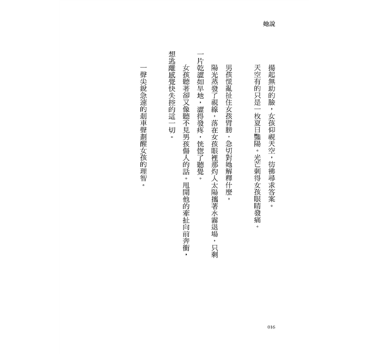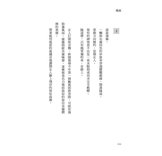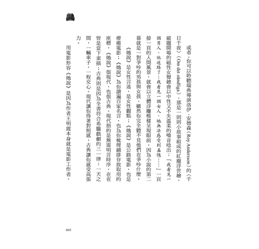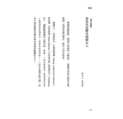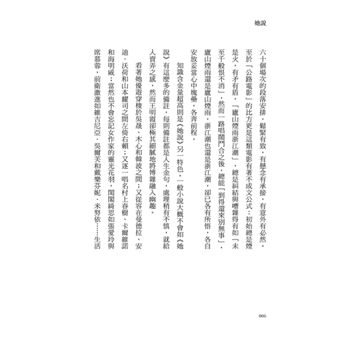 「《她說》是女性言述,是女性觀點;《她說》是公路電影,也是療癒電影;《她說》為你讀遍百家名言,也為你梳理鋪排存放取用的座標。《她說》很現代,也很古典。現代讓你得著對照感,古典讓你感受高張力。」