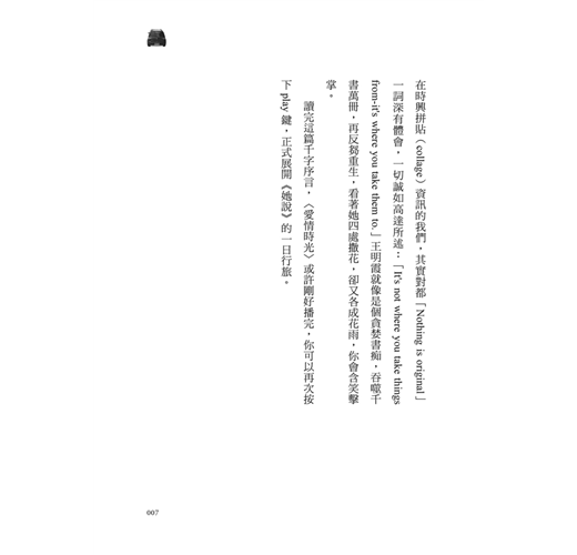 「告訴妳一個秘訣。下次腦袋裡的問題要把妳逼到抓狂前,趕快就近找間書店逃進去,然後,想像自己走進一座森林,深呼吸。讓那些從書散發出來的芬多精,幫助妳想像任何時空裡的妳,可能的樣子。等妳覺得可以安全重回地球時,記得,把那個特定時空的妳,寄放在書店裡。這樣,妳就不會在外面的世界搞丟自己。下次回來,那個妳,還會在寄放的書裡,等妳。」