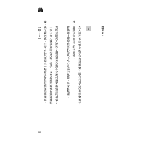 「答應我,無論發生任何事情,不要衝動跑去別的車子前面。做傻事會有蝴蝶效應的。妳得找點別的辦法,讓自己成熟長大。」