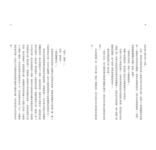 有時,飛過比海洋更荒無人跡的百里大草原之後,他碰上一個遠離塵世的農莊—這農莊在草原的浪潮間,帶著它承載的居民,似乎在急速地後退—這時,他便擺動機翼向這艘「航船」致敬。