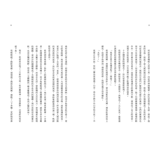 夜幕正在升起,宛如一團烏雲填滿了山谷,再也分辨不出山谷和平原了。不過村莊卻已燈火通明,那燦若群星的亮光互相輝映。他用手指按在航行燈上,使它眨著眼睛,與村落的燈火相呼應。大地傾聽著燈光的召喚,面對無邊的黑夜,家家戶戶點燃了自家的「星星」,就像把塔燈指向海洋那樣。所有遮蓋人類活動的東西都閃亮起來。法比安非常欣賞這樣的黑夜,像船隻駛進停泊港一樣,軌跡既從容又漂亮。