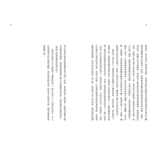 他如同一個守夜人,發現黑夜也能揭示人類的祕密:這些召喚,這些燈火,這種不安。黑暗裡這顆普通的星星,就像是一座孤零零的屋子。一顆熄滅的星星就像一座把它的愛情封閉起來的屋子,或者一座把煩惱封閉起來的房子—總之這是一座停止向世界發射信號的房子。這些待在燈前、手肘支在桌子上的農民,他們不知道自己希望的是什麼;他們不知道,在這個包圍著他們的漆黑夜晚,希望竟能傳得那麼遠。但是法比安發現了這一點:當他從千里之外飛來,感到海底的湧浪正在把呼吸著的飛機舉起來又摔下去時;當他穿過十個風暴,就像穿過戰火連天的國家那樣時;當他穿過風暴之間月光皎潔的夜空時;當他懷著必勝的信念,一個接一個地飛越這些燈火時。