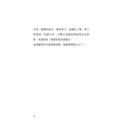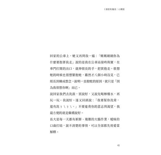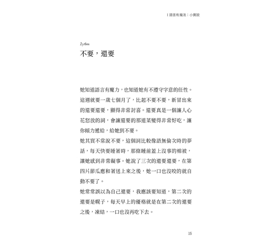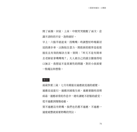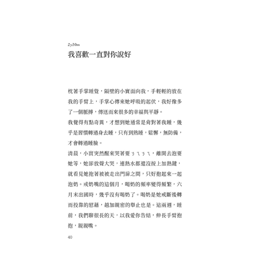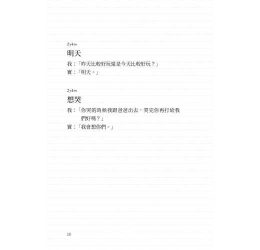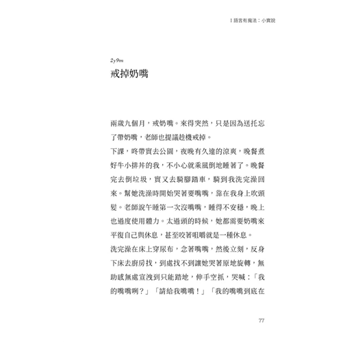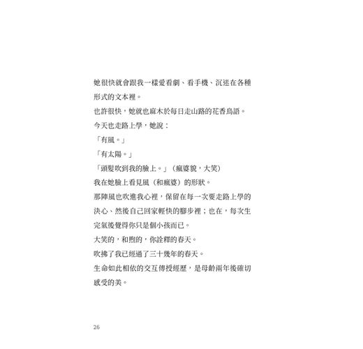 最後一次遲至進排版前才交,我發現了做母親的箇中滋味,原來是在同樣的挫折上有長進,比如一歲寫「現在」、兩歲寫「現在!現在!」到三歲已經是「能等待的現在」,成長自有把一個苦痛推翻的處方。