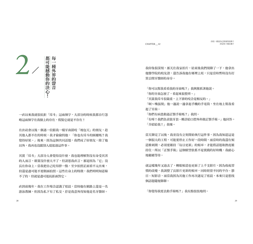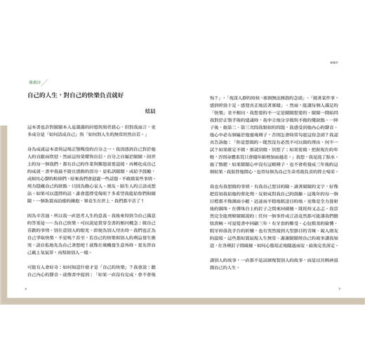 因為辛苦過,所以我一直思考人生的意義。我後來得到令自己滿意的答案是——為自己快樂。可以說是貫穿全書的相同概念:做自己喜歡的事情、別在意別人的眼光。即便為別人付出時,我們也正為自己爭取快樂,不是嗎?甚至,若自己的快樂和別人的利益發生衝突,請自私地先為自己著想吧!就像在飛機發生意外時,要先替自己戴上氧氣罩,再幫助別人一樣。