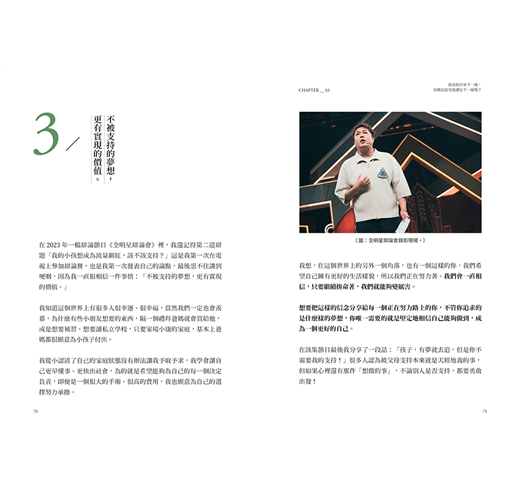 我也有我想做的事情,有我自己想冒的險。讀著關關的文字,好像把當初我給他的催化劑,反射成對我自己的鼓勵。這幾年的每一個目標都不像湖面小艇,迅速而平穩地抵達目的地。更像是全力發射後的鋼珠,在彈珠台上的釘子之間來回碰撞,既耗時又忐忑。我當然完全能理解關關說的:任何一個事件或言語竟然都可能讓我們膽怯消極。可是從書中回顧三年,有牙套的難受、心包膜炎的偷襲、假牙掉落洗手台的折騰,也有突然接到大型節目的青睞、親人朋友的溫暖,這些都如實展現人生無常。謝謝關關用自己的故事讓我知道,在各種釘子間碰撞,如何心態端正地隨遇而安,最後完美落定。