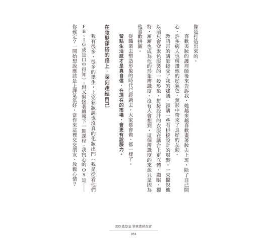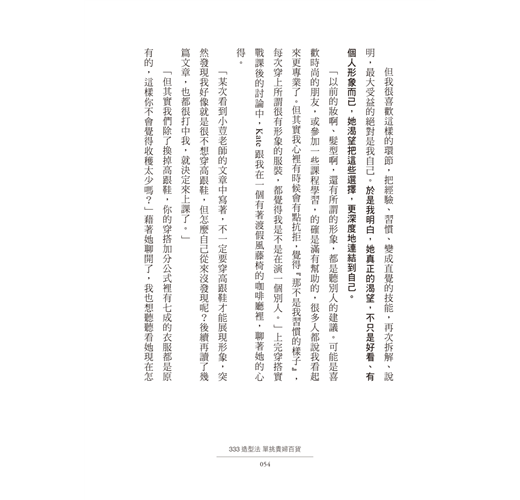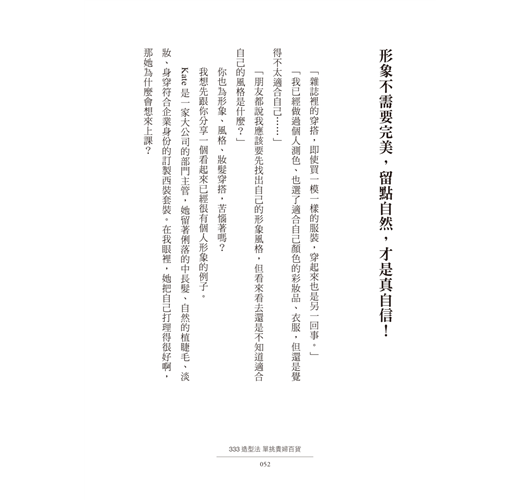 裡面還有模特親身示範妝髮服穿搭形象照,讓你一目了然。這本書的觀念好懂、好學、好用,「333造型法」在手,無限變化的穿搭造型就在這些變化中,每天省下不少搭配時間,讓出門可以更加從容不迫。