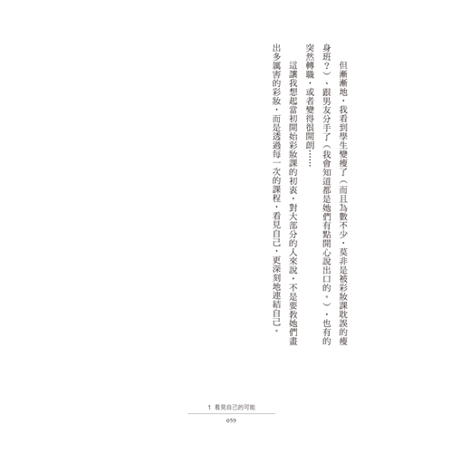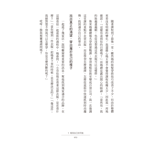 無論是暫時還沒有辦法和老師上課,或是上完課後需要持續複習心法、抑或在每季更新的流行時尚中迷失,遺忘了「打扮是為了找到更自在的自己」的精神,再翻翻這本書,都會是很好的提醒。