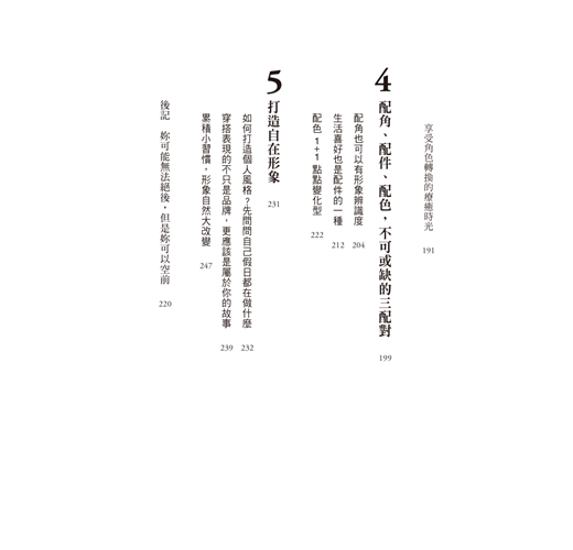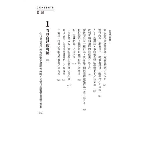 每個人天生的氣質及成長環境背景各有不同,所造就出來的個人特色也不盡相同,無論是身形上的高矮胖瘦,亦或是長相甜美、冷豔、或優雅,沒有一種裝扮是適合所有人的,如果你也跟我一樣,勇於追求屬於自己的美好,這本書所呈現的內容,恰巧補足了這份需要,透過這本書,幫助你找到最適合你的裝扮,加倍放大你的優勢,找到專屬你獨特的自信美。