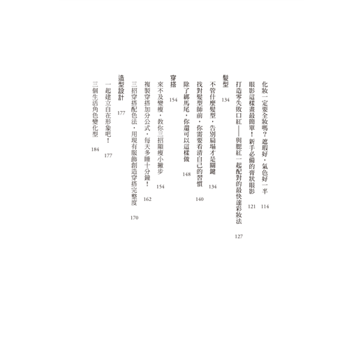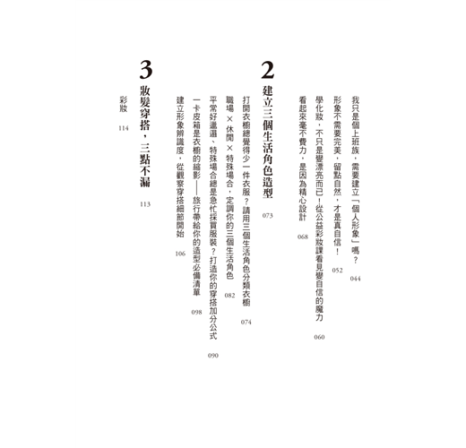 快速出門的核心小荳歸納出「333造型法」,分別有三種角色、三種妝髮服技巧和三種配對加分法。無論是在休閒、職場,還是特殊場合,你都能找到適合的穿搭風格!再來,這本書教你如何用化妝、髮型和服裝穿搭來打造完美形象。最後,透過配色、配件、配角,讓你在搭配服裝時更有條理,更有品味!