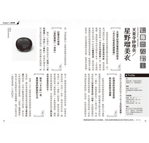 詳細介紹角色的個性、生長背景和行事作風,深度理解背後隱藏的動機。阿奎亞對愛所抱持的感情,不單單只是親情而已嗎?眼睛中的星星,是明星魅力和自信的象徵?黑化的露比雙眼出現的黑色星星又代表了什麼?她與哥哥阿奎亞的關係即將惡化?!