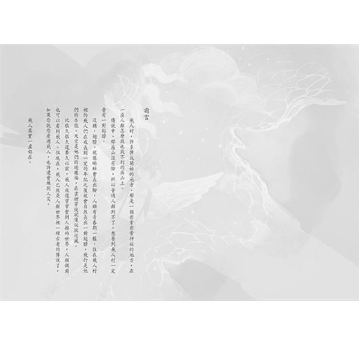 「生活在飛人村裡的生物種族非常豐富多元,也許比人類世界的還多,因為氣候條件相似的關係,人類世界的生物也是可以在飛人村存活的,這些,往後你們都會在課程裡學習到。因為我們飛人族可以飛得比雲還高,而且神祕得就像雲一樣變化莫測,所以,在很少數很少數看過我們的人類中,有人也稱呼我們為雲族。」大為老師說。