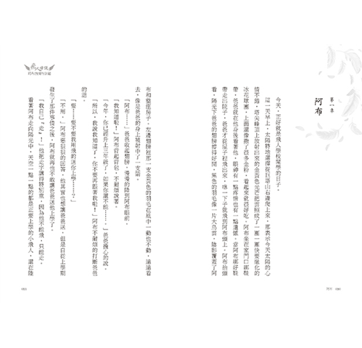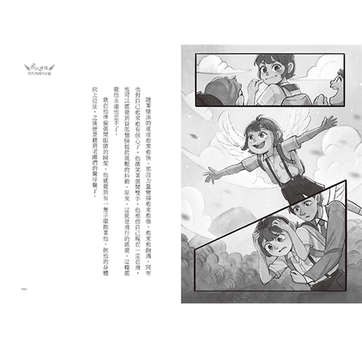 這本書實現了大人與小孩關於飛翔的想望,那種徜徉於天空的自在舒適,那種順著氣流的涼爽舒暢,真是幸福無比。書中的主角是阿布,他生活在人類肉眼看不見的雲朵之上,裡面有座小小的村子,那裡每一個小孩上到一年級後若通過飛行測驗而長出翅膀,像是一場專屬飛人村的「成年禮」,擁有這對與眾不同、閃閃發亮的翅膀,正是飛人族的象徵,也是超絕的人生證明,代表自己已經邁入人生下一階段,需承擔更多人生責任與社會期待。