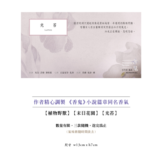 或許香氣對許多人來說是抽象的概念,是神祕的、靈性的、幽深的,但透過文字與香氣連結,宛如與乃方自然而然的個性共生一樣,已成為她既巫豔又靈騷的風格標誌。閱讀《香鬼》,喚起香水曾帶給我們的悸動,如同不一樣的旅程、不一樣的啟發,值得我們一起去探險體驗。